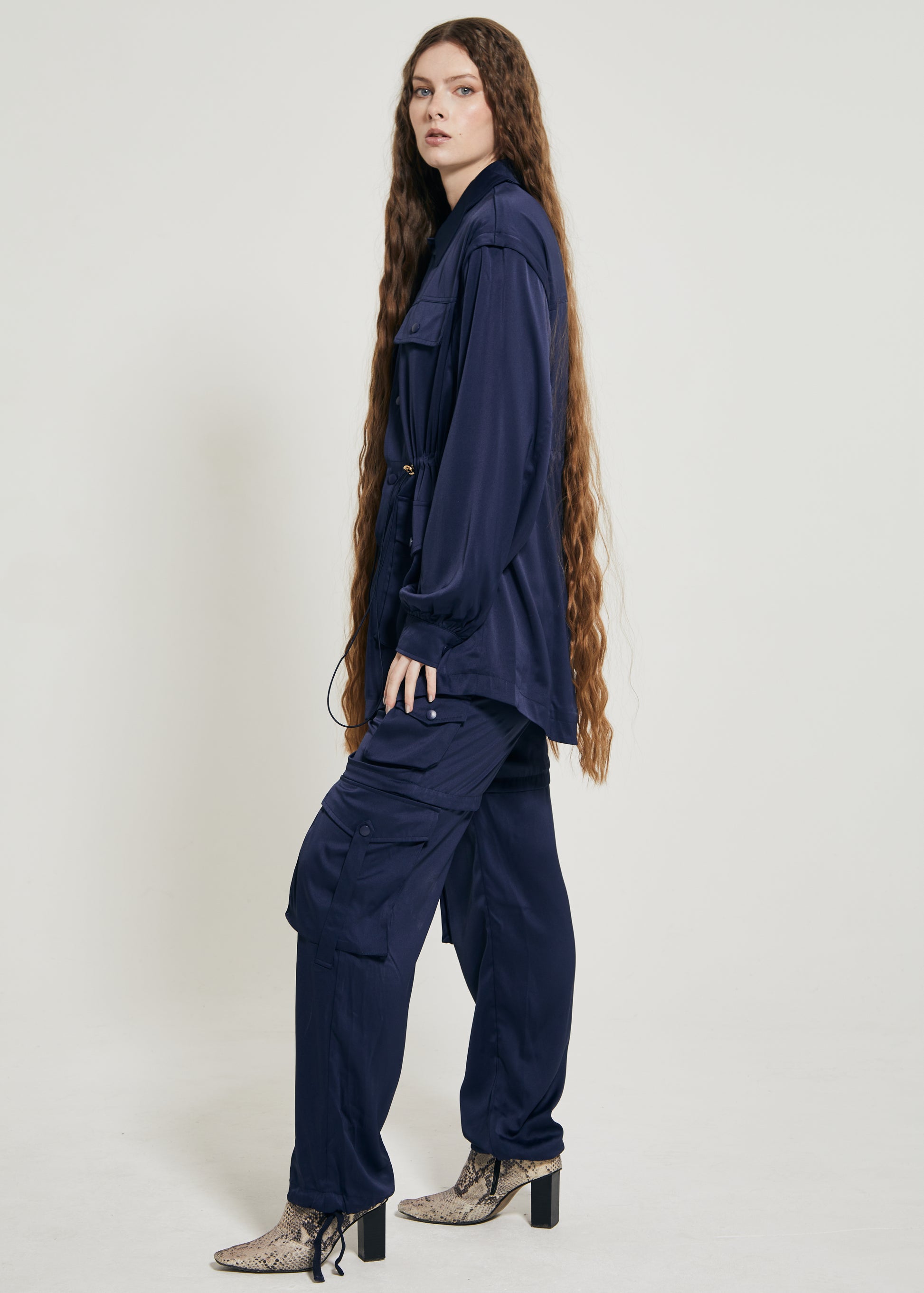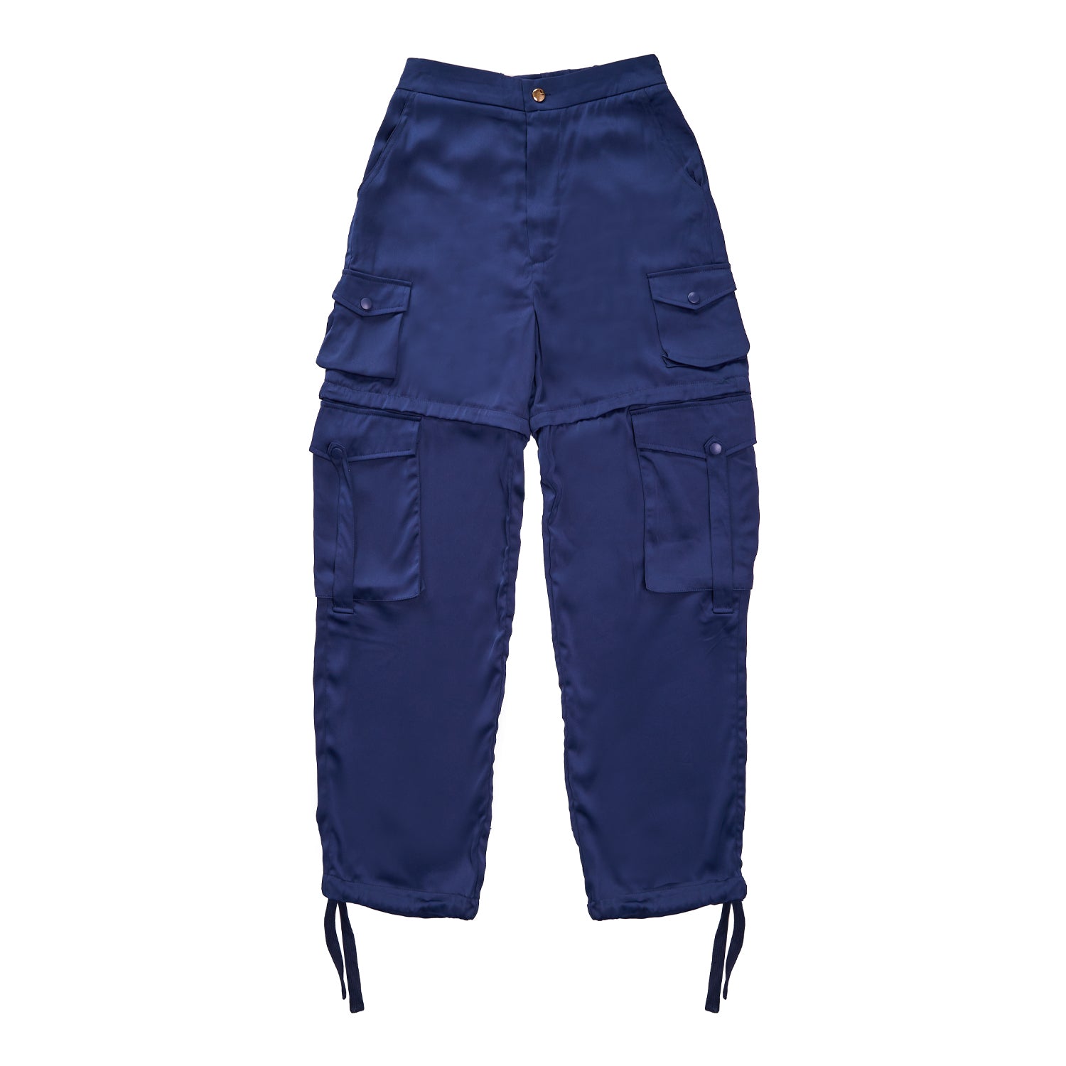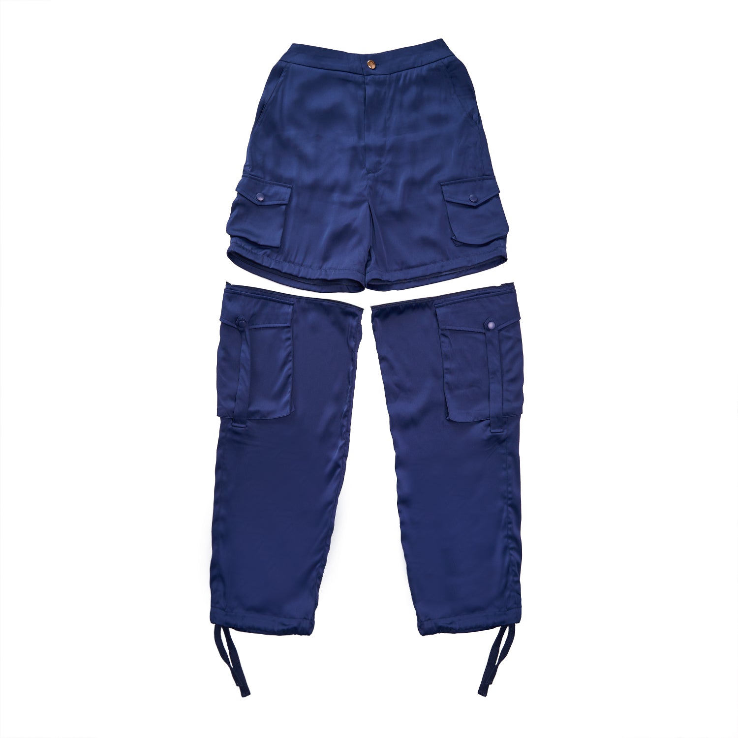Multi-wearable navy satin utility pant, zipping off above the knee to be worn as a cargo short.
