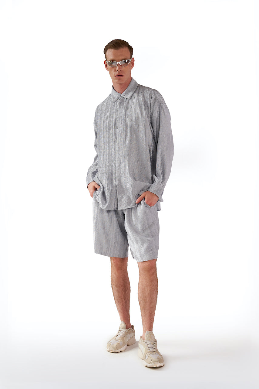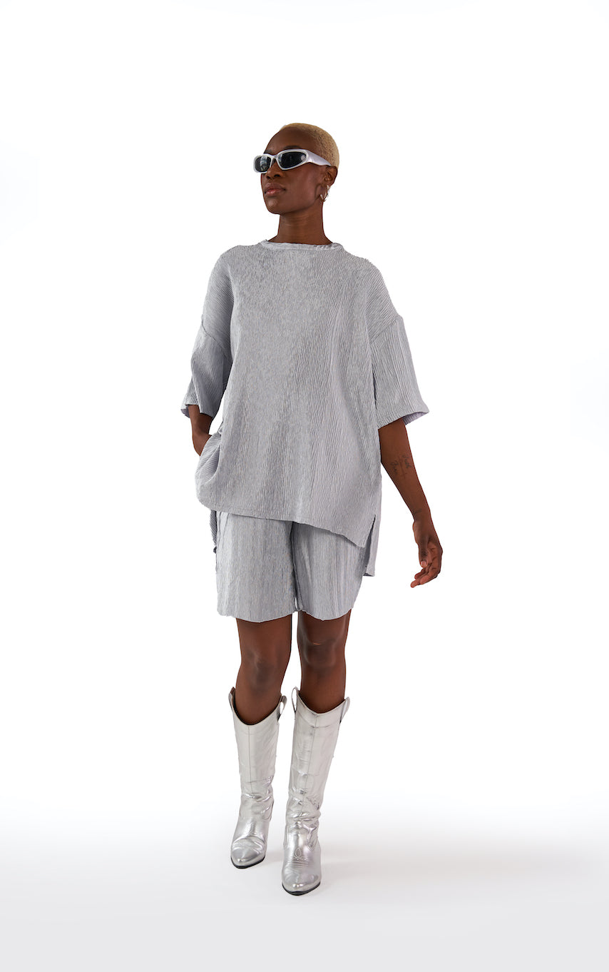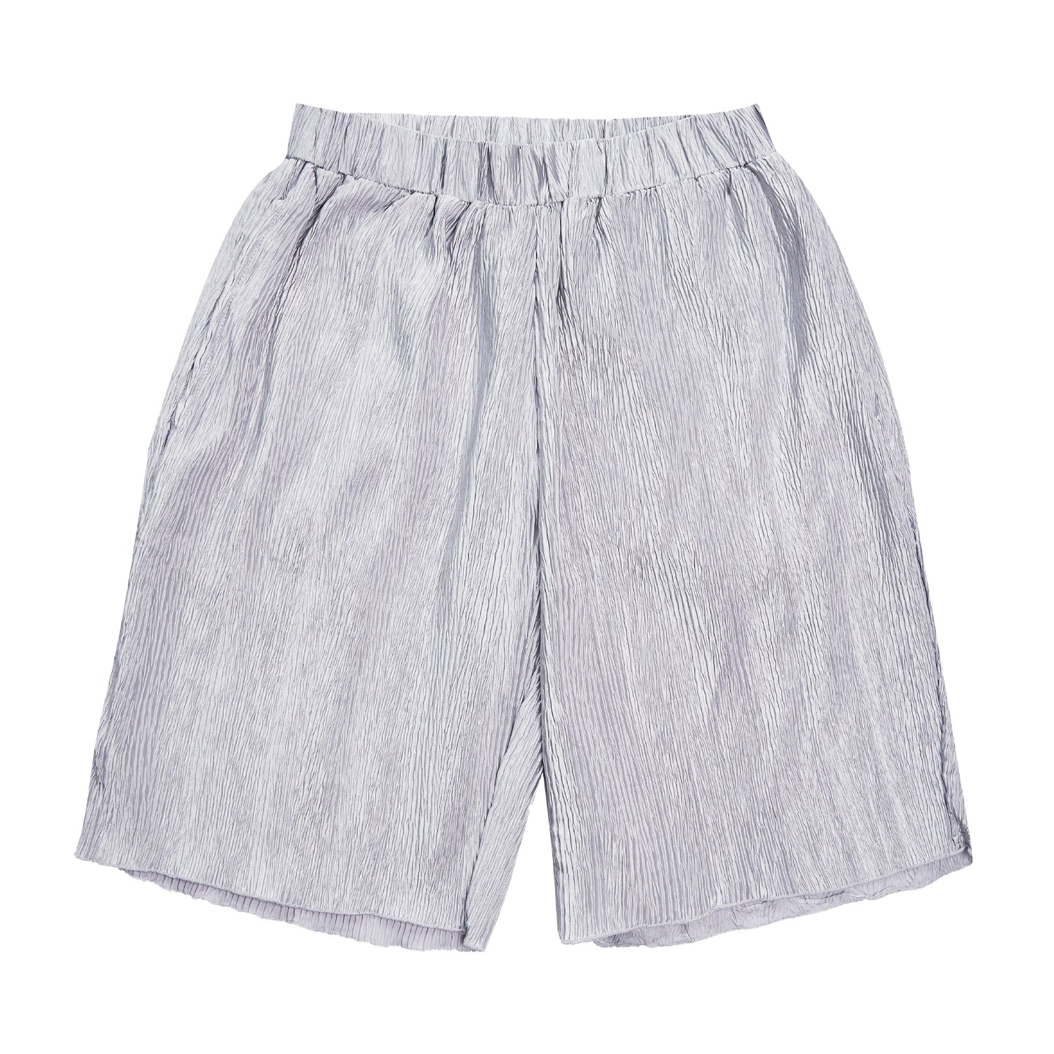 A relaxed longline short with self fabric elasticated waistband and set in pockets. This fabric is textured, shiny, and doesn't need to be ironed. Because of the silhouette we have reduced our sizing scale to just 2 sizes, making it easier for all bodies to wear. The M-L fits up to a Size UK 18/38" waist. See Neufit page for more details.